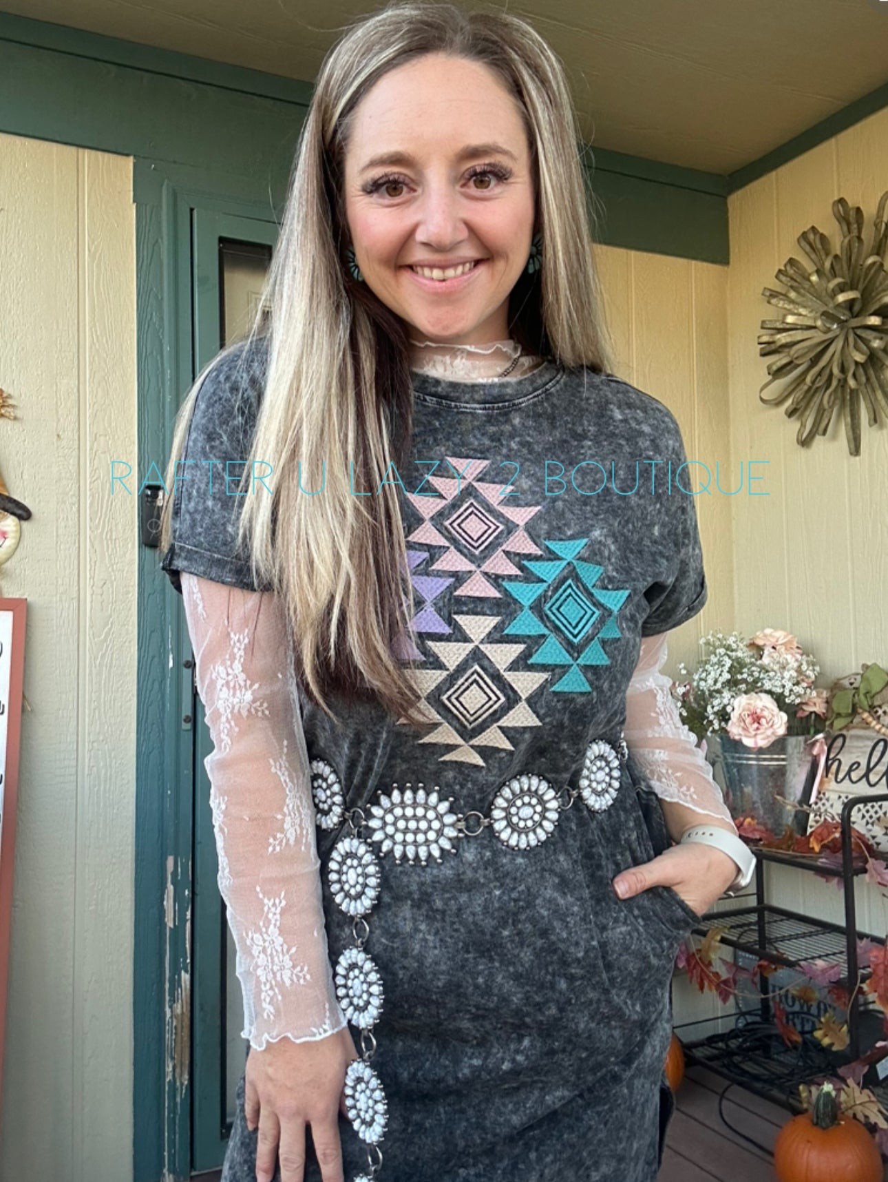 Black Acid Wash Tshirt Dress w/ Aztec Embroidery